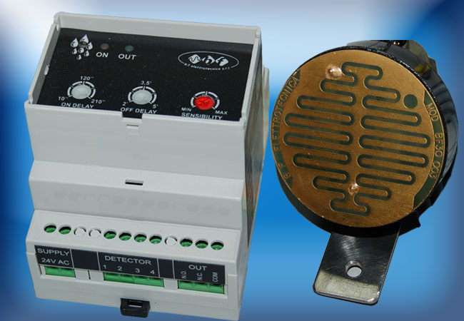 La centralina, montata in contenitore modulare, permette la regolazione dei tempi di ritardo sull'azionamento dell'uscita, sul disinserimento dell'uscita e la regolazione della sensibilità della sonda esterna. Sul pannello frontale sono inseriti anche tre led che visualizzano la presenza di alimentazione, lo stato dell'uscita e la presenza di pioggia. La sonda esterna è dotata di un led che indica la corretta alimentazione, ed è corredata di staffa di fissaggio in acciaio inox per l'installazione della sonda sia su superficie verticale che orizzontale.